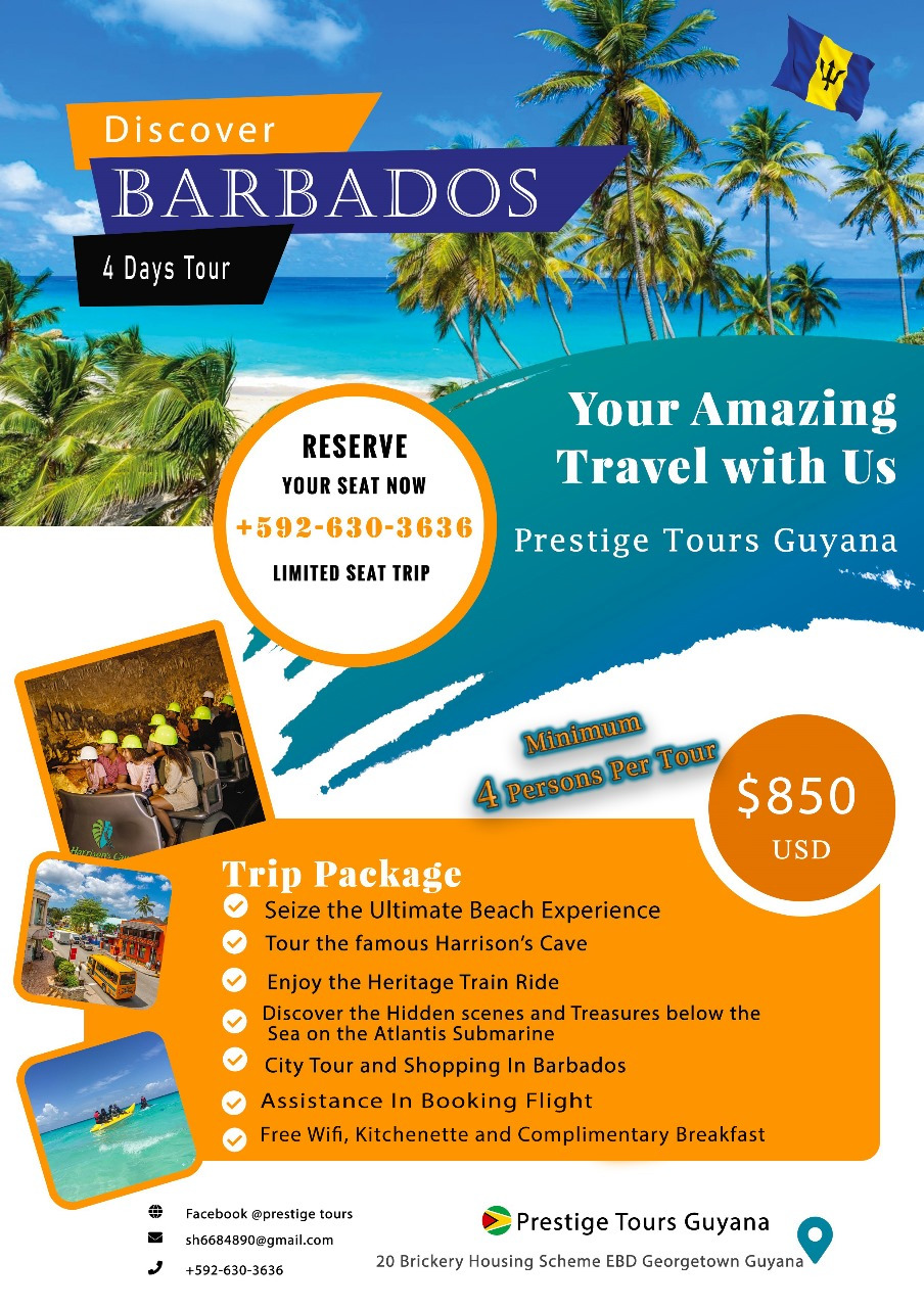 Come join us on a fascinating expedition to discover the hidden gems of Guyana, Suriname, and the captivating island of Barbados. We have made some price changes to the Barbados 4 Days Tour. Please contact us at the phone number at the bottom of this page for further information!